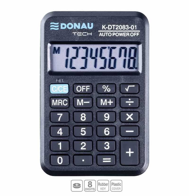 Kalkulator kieszonkowy DONAU TECH, 8-cyfr. wyświetlacz, wym. 127x104x8 mm, czarny
