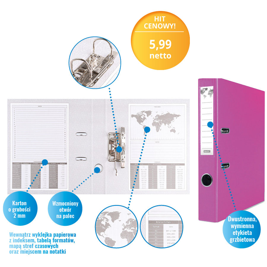 Ekonomiczny i praktyczny segregator to doskonałe rozwiązanie do przechowywania i porządkowania dokumentów w biurze oraz w domu. Wykonany z trwałego kartonu o grubości 2 mm, pokrytego jednostronnie matową folią PP, zapewnia długą żywotność i odporność na uszkodzenia.