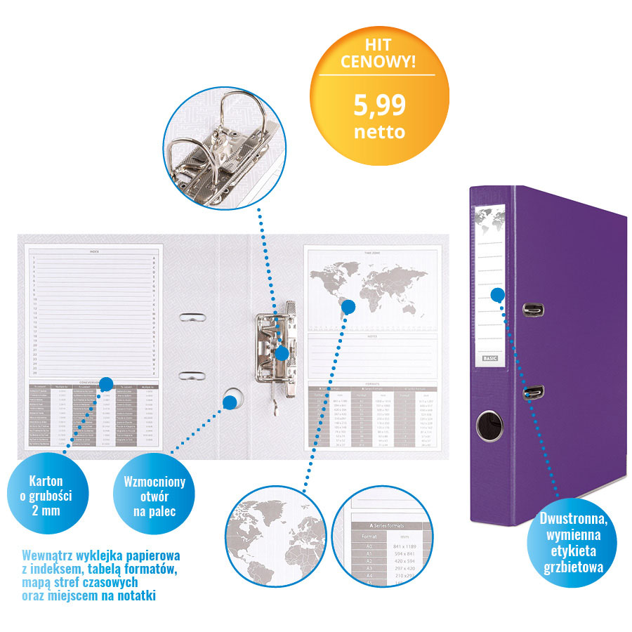 • z metalową blaszką skoroszytową oraz 4 dziurkami umożliwiającymi wpięcie wąsów do segregatora
