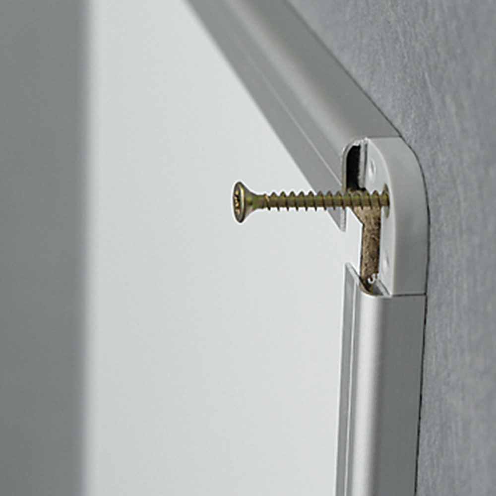 Tablica została osadzona w ramie z profilu aluminiowego w kolorze srebrnym, wykończonej popielatymi narożnikami, które dodają jej elegancji. Wytrzymała konstrukcja gwarantuje stabilność, a nowoczesny wygląd sprawia, że doskonale wpisuje się w każde wnętrze.