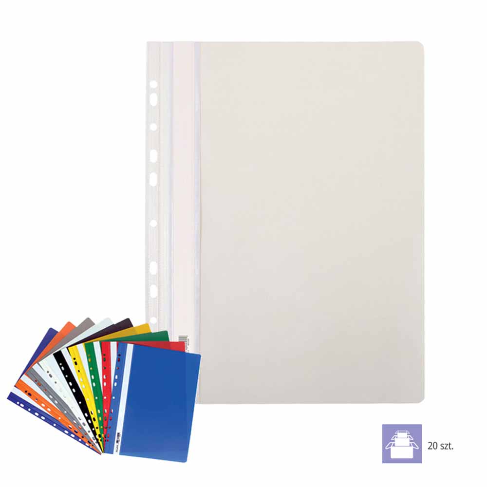 Boczna perforacja pozwala na łatwe wpięcie skoroszytu do segregatora z dowolnym mechanizmem, co zwiększa możliwości organizacji i archiwizacji dokumentów. Wewnętrzna blaszka i wąs o długości 16,5 cm umożliwiają bezpieczne przechowywanie dokumentów o grubości do 20 mm.